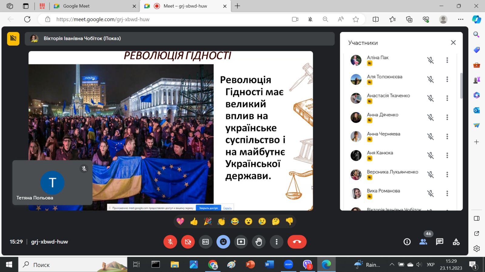 Кафедрою маркетингу та торговельного підприємництва було організовано виховну годину, присвячену “Дню свободи та гідності”, яку провела Ус Юлія Володимирівна. 21 листопада Україна відзначає День Гідності та Свободи, а також наступну річницю Революції Гідності. У ході заходу згадали героїчні події, які остаточно затвердили євроінтеграційний шлях. Під час Революції Гідності українці продемонстрували світові справжню сутність демократичних цінностей. Нині, під час війни, боротьба за них об’єднала навколо України всі цивілізовані країни. Ми довели, що згуртувавшись заради спільної мети, стаємо непереможними. Наші герої – це обличчя вільної та незалежної України. Багато тих, хто під час Революції Гідності був ще дитиною, сьогодні захищають Україну від російської агресії. Шануємо героїв, підтримуємо захисників. Віримо в щасливе майбутнє української держави!