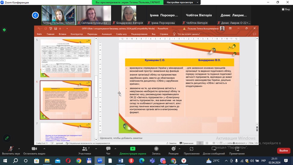 На кафедрі маркетингу та торговельного підприємництва УІПА відбулася чергова зустріч зі стейкхолдерами освітньо-професійної програми “Облік і оподаткування” підготовки фахівців першого рівня вищої освіти за спеціальністю 071 “Облік і оподаткування”, гарант ОПП – канд. екон. наук, доц. Польова Т.В. Було обговорено проєкт ОПП на 2024-2025 н.р. Виступили рецензенти освітньої програми з рекомендаціями та пропозиціями: