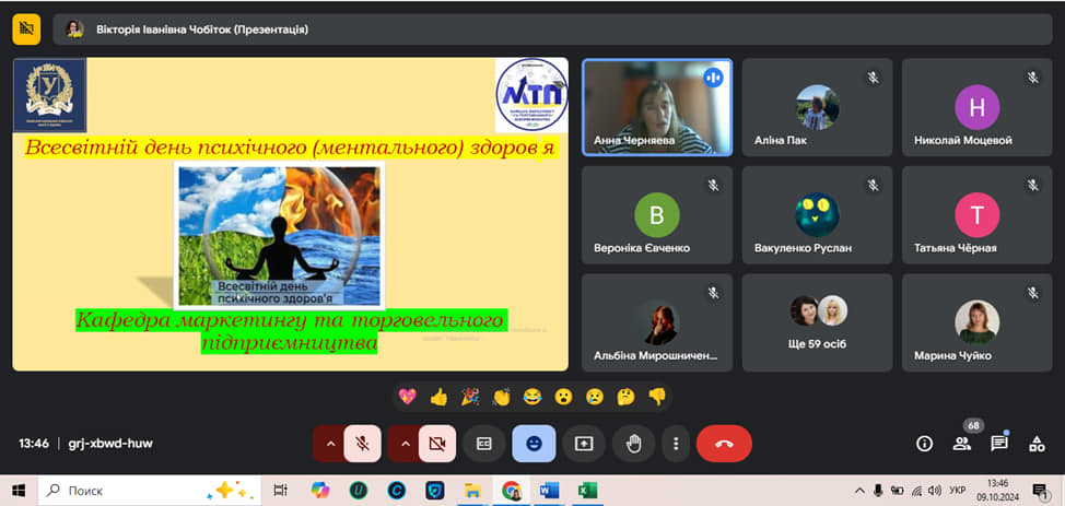 Напередодні святкування Всесвітнього дня психічного (ментального) здоров’я, який офіційно відзначають у світі та в Україні щороку 10 жовтня, доцентом кафедри маркетингу та торговельного підприємництва Анною ЧЕРНЯЄВОЮ та магістеркою групи ДМТ-24мг Алісою ХОКОВОЮ, було проведено кафедральний виховний захід, присвячений цьому святу!Актуальність даної теми напевно і не потрібно відзначати, бо сьогодні як ніколи ми, українці, як оголені дроти, дуже потребуємо захисту свого не тільки фізичного здоров’я, а й своєї душі, свого духу!