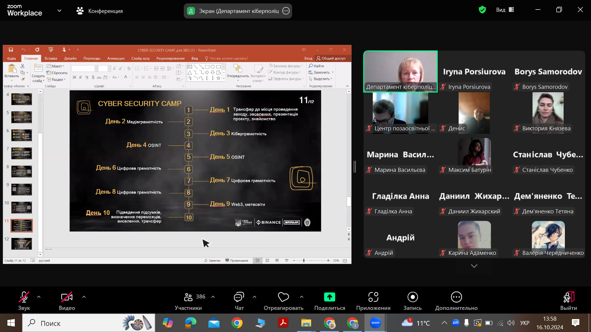 Здобувачі і співробітники кафедри Маркетингу та торговельного підприємництва ННІ УІПА ХНУ ім.Каразіна відвідали онлайн зустріч з Людмилою Федоровою, начальником сектору оперативного пошуку та партнетрства в сфері інформаційних технологій УПК в Харківській області Департаменту кіберполіції НПУ, яка більш детально розповіла про конкурс для студентів CYBER SECURITY CAMP за підтримки кіберполіції України, компанії Binance, ХНУВС та ГО «Брама».Метою конкурсу є підвищення обізнаності молоді в питаннях цифрової безпеки, протидії онлайн-загрозам та розвитку навичок у сфері кібербезпеки. Конкурс включатиме чотири етапи: 1. Тестування на логічне мислення. 2. Вирішення квестових завдань. 3. Представлення відеопрезентацій. 4. Практичне навчання для переможців.
