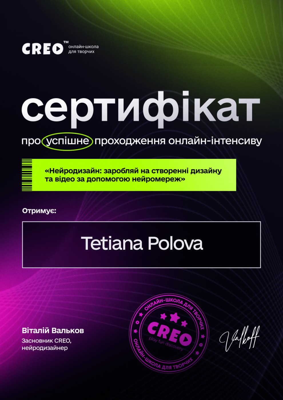 Доцент кафедри МТП ХНУ ім. В.Н. Каразіна Польова Тетяна Володимирівна пройшла дводенний AI-інтенсив з нейродизайну від онлайн-школи для творчих “CREO” Учасники занурилися у магію промптів: як писати запити, що дають естетичний результат, а не AI-картинку.