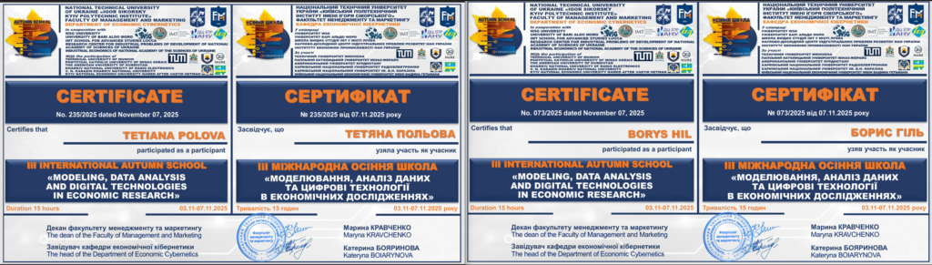 Викладачі кафедри МТП підвищили кваліфікацію завдяки участі у ІІІ Міжнародній Осінній школі «Моделювання, аналіз даних та цифрові технології в економічних дослідженнях», яка була організована кафедрою економічної кібернетики ФММ КПІ ім. Ігоря Сікорського та Інститутом економіки промисловості НАН України. Отримали сертифікати на 15 годин.