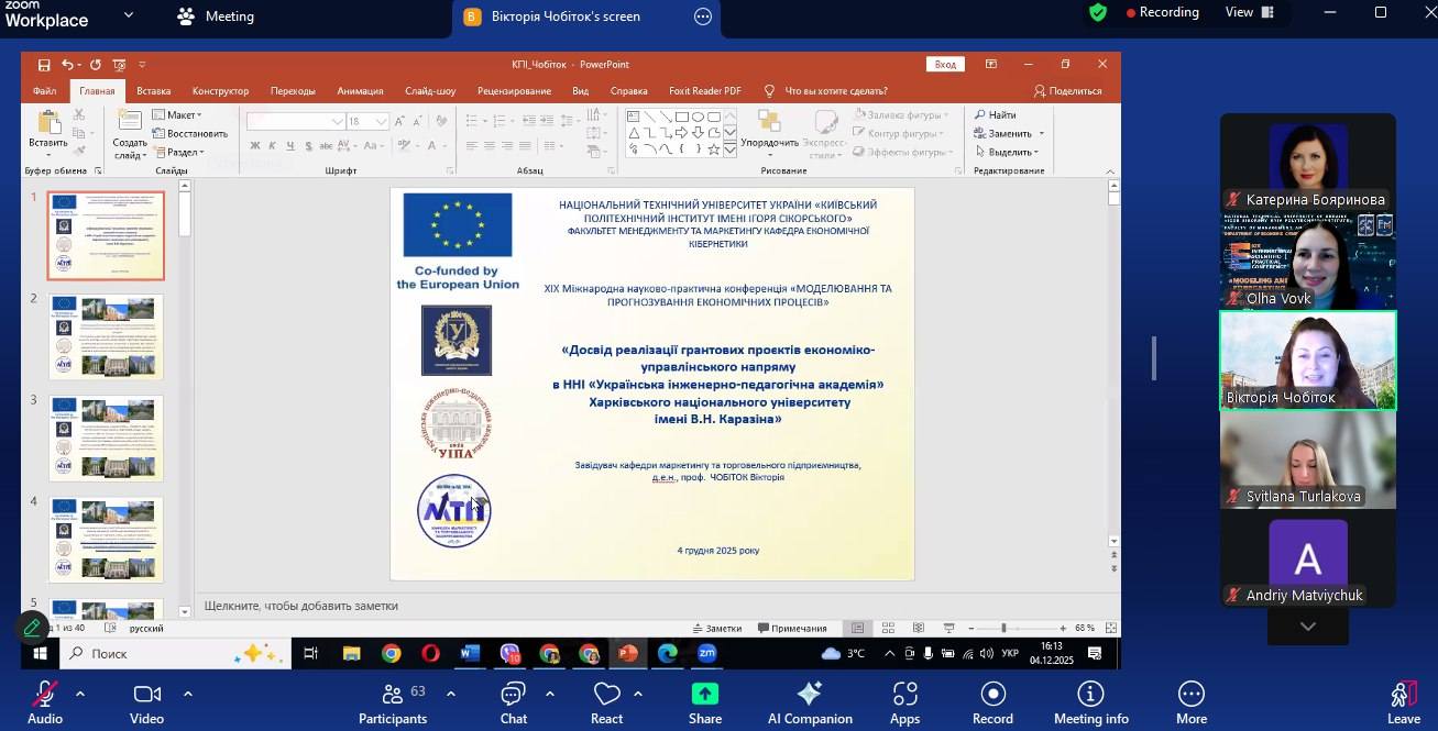Викладачі та здобувачі кафедра МТП ННІ УІПА ХНУ ім.В. Каразіна доєдналися на запрошення колег кафедри економічної кібернетики (Оля Вовк та Ольга Кравченко) факультету менеджменту та маркетингу Національного технічного університету України «КИЇВСЬКИЙ ПОЛІТЕХНІЧНИЙ ІНСТИТУТ ІМЕНІ ІГОРЯ СІКОРСЬКОГО» до XIХ Міжнародної науково-практичної конференції «МОДЕЛЮВАННЯ ТА ПРОГНОЗУВАННЯ ЕКОНОМІЧНИХ ПРОЦЕСІВ» 4 грудня 2025 року.Де були запрошені фахівці вітчизняних та зарубіжних закладів вищої освіти, представники Академії кадрового потенціалу, Науково-дослідного центру індустріальних проблем розвитку НАН України, Інституту економіки промисловості Національної академії наук України, Українського національного комітету Міжнародної торгової палати та інші.