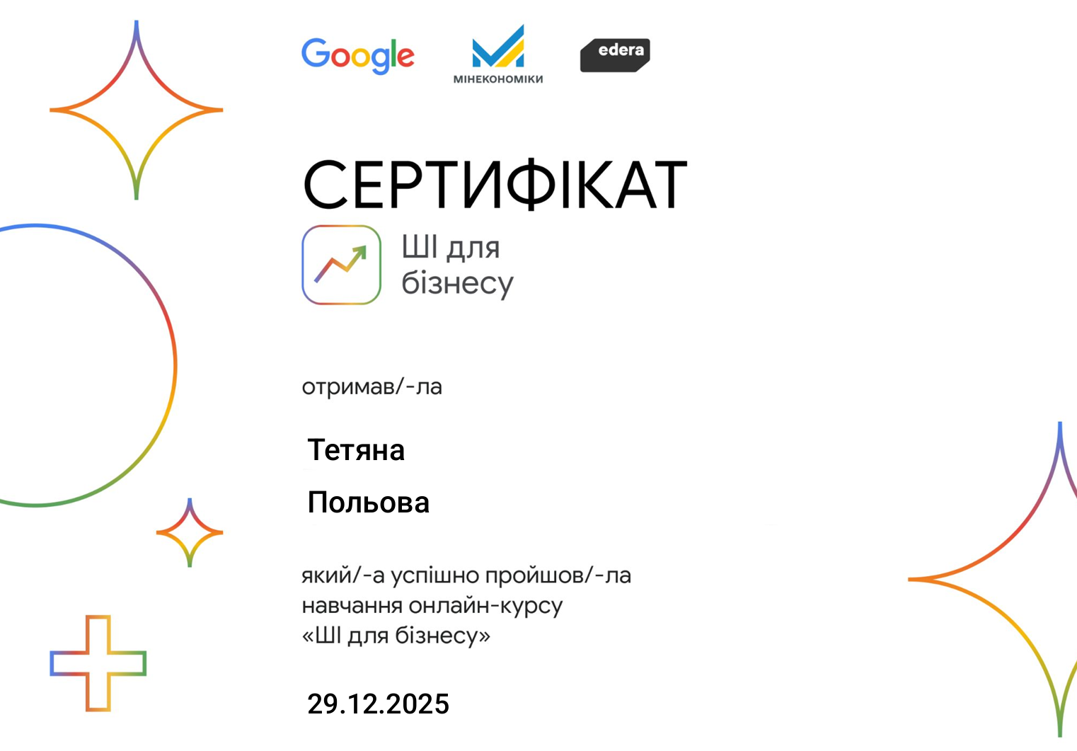 Доцент кафедри МТП ННІ «УІПА» ХНУ ім. В.Н. Каразіна Польова Тетяна Володимирівна успішно пройшла онлайн-тренінг у межах програми «Штучний інтелект для бізнесу від Google» та отримала відповідний сертифікат за результатами опанування п’яти модулів навчання та зустрічей з експертами.