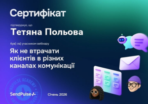 Доцент кафедри МТП ННІ «УІПА» ХНУ імені В. Н. Каразіна Польова Тетяна Володимирівна взяла участь у вебінарі «Як не втрачати клієнтів в різних каналах комунікації» від Академії SendPulse Під час вебінару учасники дізналися, чому класичні портрети клієнтів більше не працюють