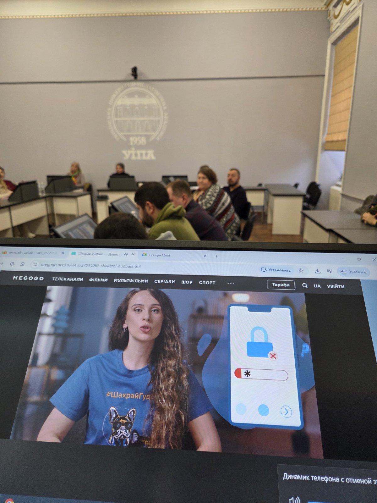 Учасники переглянули відеоматеріали, присвячені таким актуальним темам, як захист фінансового номера телефону, соціальна інженерія, фішинг, безпечне використання смартфонів та публічних Wi-Fi-мереж, правила безпечного онлайн-шопінгу, двофакторна автентифікація, а також типові схеми шахрайства під час пошуку роботи.