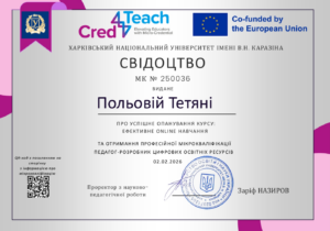 Це була насичена програма обсягом 6 кредитів ЄКТС (180 академічних годин), присвячена найактуальнішим компетенціям сучасного викладача: Штучний інтелект в освітньому процесі: вивчення можливостей ШІ для організації та підтримки навчання. Створення навчального відеоконтенту: розробка матеріалів з урахуванням принципів візуального дизайну та технічної якості. Розробка комплексу цифрових ресурсів та оцінювання у цифровому середовищі. Етика та безпека: дотримання норм цифрового етикету та захисту даних. Усі компоненти програми завершені з оцінками 92–100 балів. Цей досвід, отриманий у межах проєкту Cred4Teach, що співфінансується Європейським Союзом, дозволяє мені не просто йти в ногу з часом, а професійно проектувати сучасне освітнє середовище. Дякуємо Каразінському університету за високі стандарти та інноваційні інструменти! Рухаємось далі — до нових цифрових вершин! 💻✨
