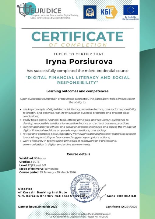 З 29 січня – 30 березня 2026 р. к.ек.н., доцентом кафедри маркетингу та торговельного підприємництва Порсюровою Іриною Петрівною успішно пройдено англомовний курс мікро-кредитації «Digital finanial literacy and social responsibility», отримано результати навчання та компетенції:‒ use key concepts of digital financial literacy, inclusive finance, and social responsibility to identify and describe real-life financial or business problems and present clear conclusions;