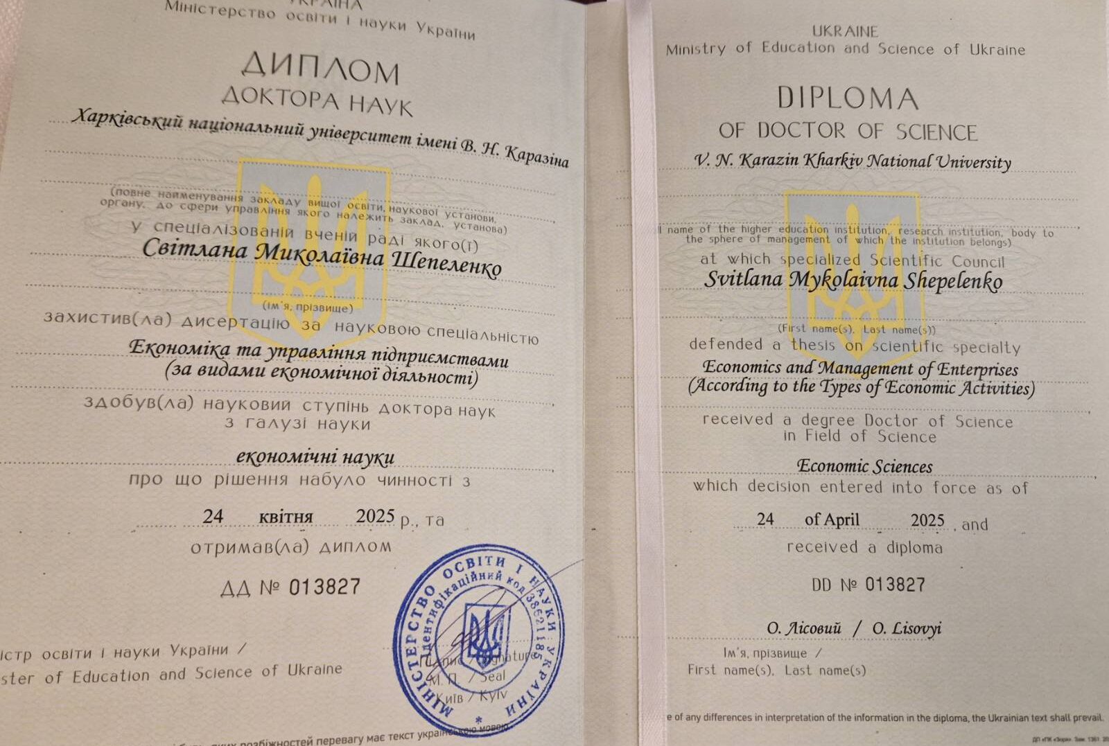 Відповідно до наказу Міністерства освіти і науки України № 621 від 24 квітня 2025 р. присуджено науковий ступінь доктора економічних наук Шепеленко Світлані Миколаївні!