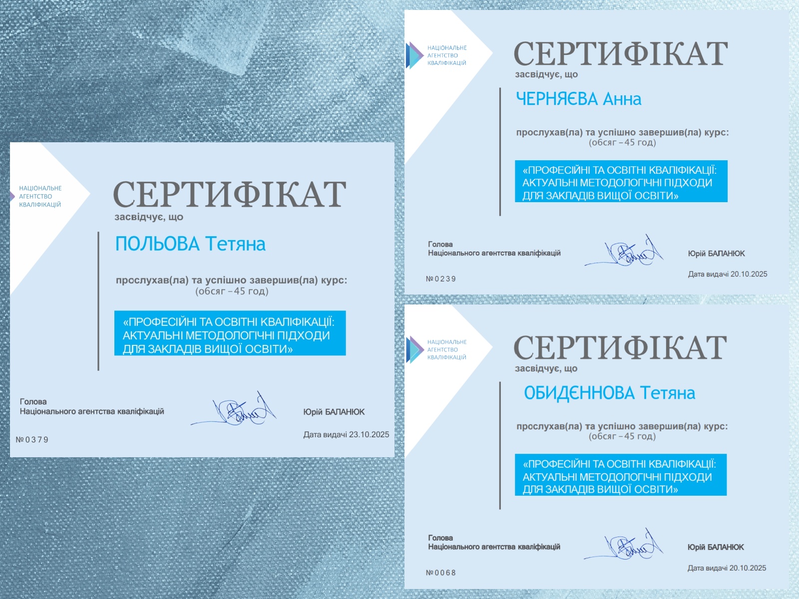 Викладачі кафедри підвищують кваліфікацію. У рамках постійного вдосконалення освітніх стандартів, викладачі у жовтні 2025 року завершили курс «Професійні та освітні кваліфікації: Актуальні методологічні підходи для закладів вищої освіти» та отримали сертифікати від Національного агентства кваліфікацій, що засвідчують проходження 45-годинного навчання. Цей курс є ключовим для інтеграції передових методик викладання та формування кваліфікацій, що відповідають сучасним вимогам ринку праці та європейським стандартам. Подібні ініціативи є важливим кроком на шляху до підвищення якості вищої освіти в Україні та підготовки конкурентоспроможних фахівців. |