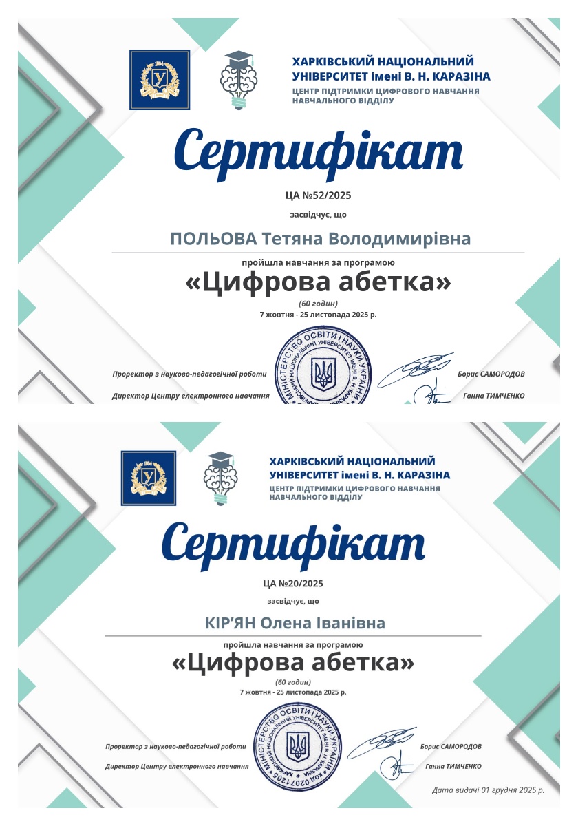 Викладачі кафедри МТП пройшли воркшопи від Центру підтримки цифрового навчання Харківського національного університету імені В.Н. Каразіна і отримали сертифікати за програмою «Цифрова абетка» (обсяг 60 годин) з 07.10.2025 по 25.11.2025 р. |