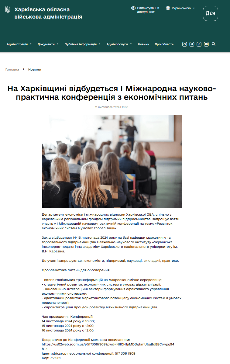 Кафедра маркетингу та торговельного підприємництва Навчально-наукового інституту «Українська інженерно-педагогічна академія» Харківського національного університету ім. В. Н. Каразіна запрошує до участі в І Міжнародній науково-практичній конференції «РОЗВИТОК ЕКОНОМІЧНИХ СИСТЕМ В УМОВАХ ГЛОБАЛІЗАЦІЇ» науковців, викладачів, практиків, молодих вчених, докторантів, здобувачів вищої освіти. Конференція запланована на 14-16 листопада 2024 р., м. Харків. З інформаційними листами можна ознайомитися за посиланнями: