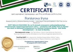 9-11 лютого 2026 р. доцентом кафедри маркетингу та торговельного підприємництва Порсюровою І.П. успішно завершено триденний практикум « SOFT SKILLS COACHING: як за 12 місяців опанувати найзатребуванішу компетенцію людиноцентричного світу — розвиток soft skills» та отримано сертифікат слухача.